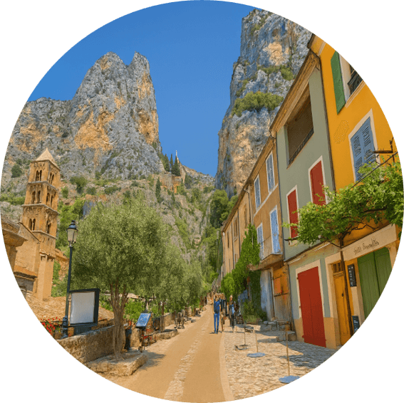 Moustiers-Sainte-Marie, ranked among the most beautiful villages in France, rises like a mineral jewel set against the cliffs. Its terraced lanes, artisan workshops and luminous atmosphere create a stop of rare beauty – both gentle and spectacular.